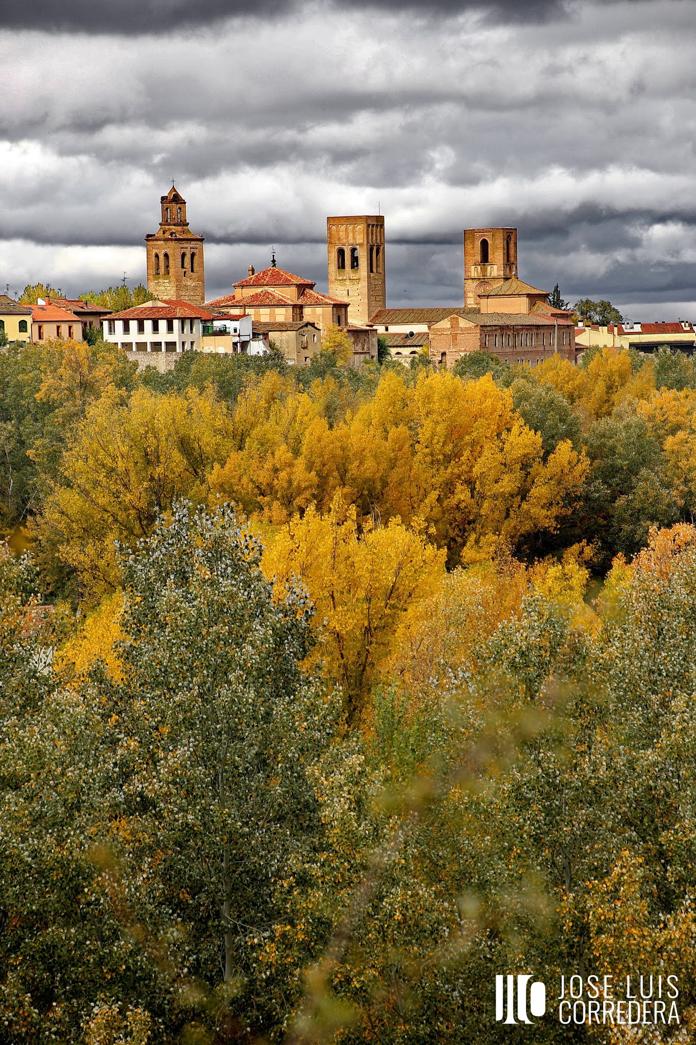 Vista de izquierda a derecha de la imagen de la torre de Santa María la Mayor, las torres gemelas de San Martín y la torre del homenaje del Castillo de Arévalo, respaldado con los colores y luces del otoño vistos desde la cuestas del río Adaja.